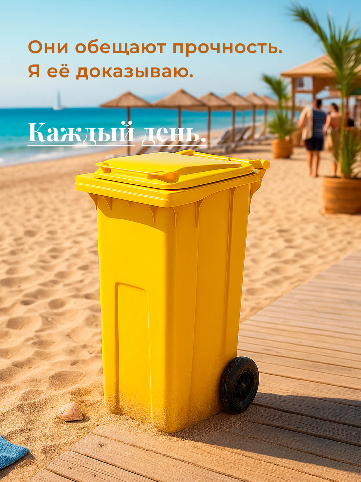 Благодаря прочным колёсам контейнер легко перемещается по любой поверхности. Корпус из первичного ПНД выдерживает морозы, удары и воздействие ультрафиолета, а плотная крышка надёжно удерживает запахи и защищает от осадков.