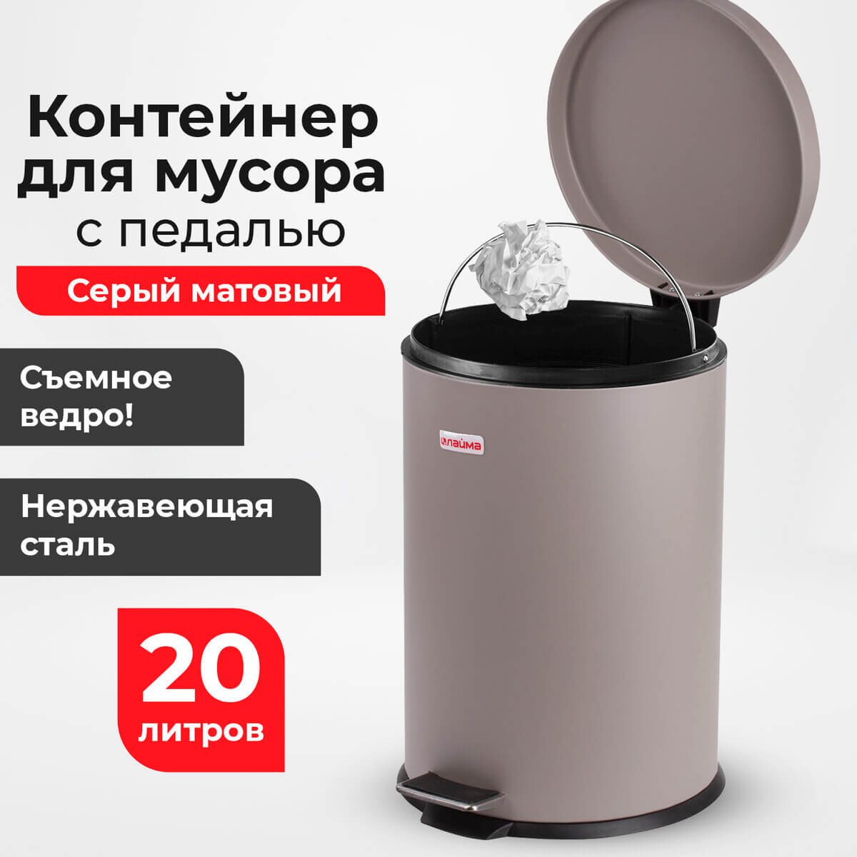 Ведро-контейнер для мусора (урна) с педалью LAIMA Classic, 20 л, серое, матовое, металл, со съемным внутренним ведром